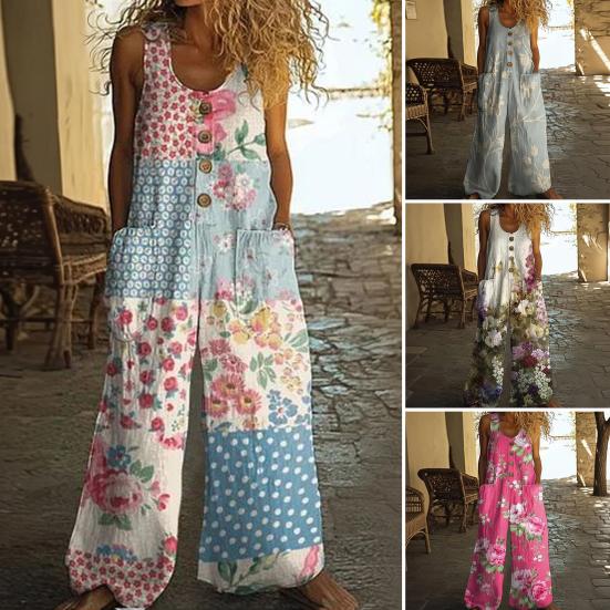 Women's Floral Printed Wide Leg Jumpsuit Sleeveless Button Front Romper Summer Casual Loose Overall with Pockets — tüm dünyaya ücretsiz teslimat ile online ürün satın alın!