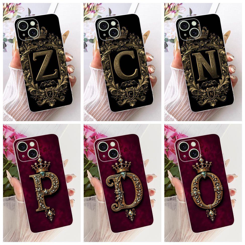 Transparent For iPhone 15 Case Cover Transparent Luxury Crown A-Z Letters 2D Flat Pattern Soft Casing A3092 A3090 A2846 A3089