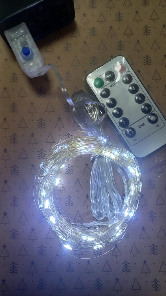 Замовлення доставлялося 37 днів у складі великої збірної посилки. Це гірлянда 20 м з батарейним блоком на 3*АА і ІЧ пультом. Ціла і майже робоча. Не дуже яскрава як і всі "струнні" гірлянди через слабкі світлодіоди. Кабель-дріт тонкий, ніжний. Батарейний блок для зовнішнього застосування, з ущільнювачами і защіпками. Має 8 режимів, які коректно перемикаються ізольованою кнопкою на корпусі. Має інфрачервоне керування, приймач в середині корпусу. Але з пультом не дружить. Пульт лише може увімкнути і задати кілька режимів, і то не за порядком. Решта кнопок просто не керують нічим. В пульті батарейки cr2025 немає.