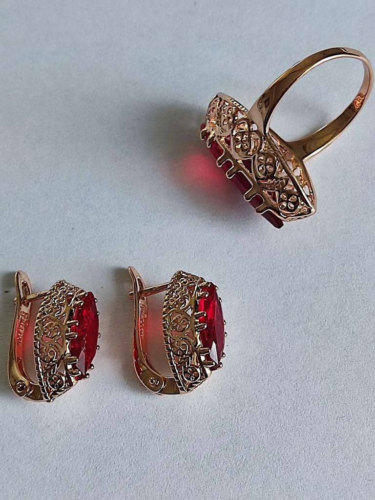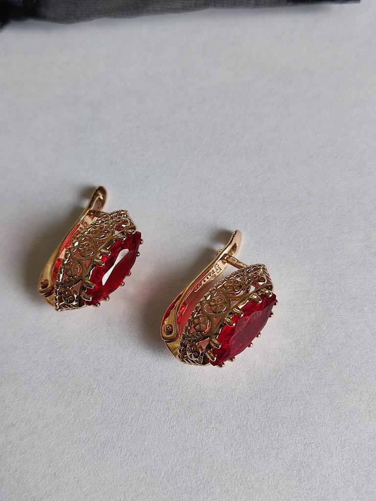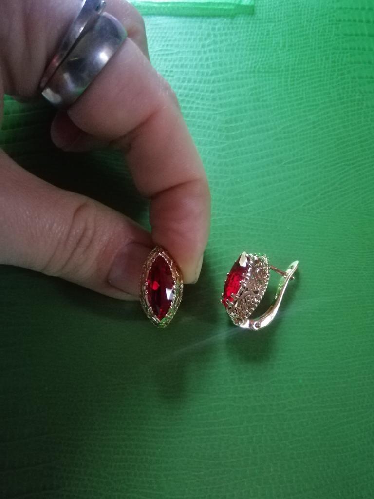 Сережки з англійською застібкою. Камінь у формі човника насиченого темно червоного кольору. Брала в комплект до такого ж перстня. В продавця також є із зеленим каменем, дуже гарного насиченого кольору. Сережки схожі на вінтажні, дрібні узори якісно виконані. Схожі на золоті.