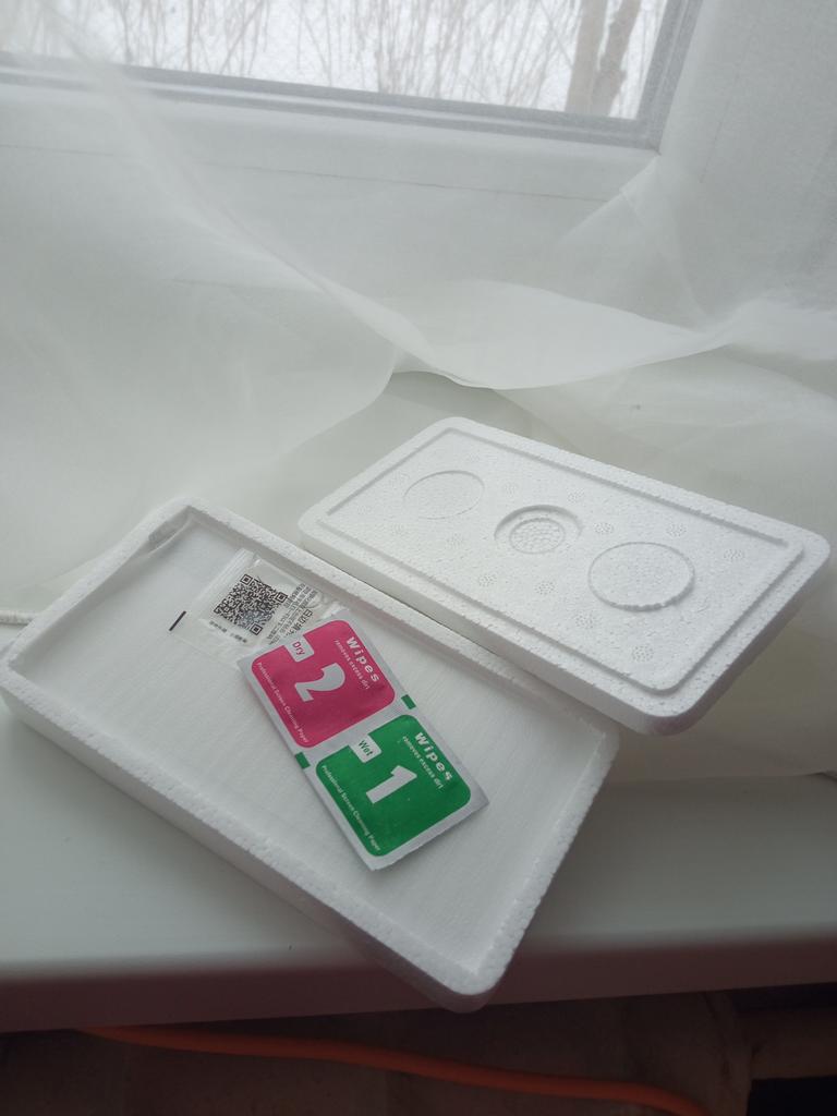 Товар не пошкоджений. Добре упакований: в коробці з пінопласту, скло ще й у мішечку з м'якого матеріалу. В комплекті також дві серветки та рідина для очистки дисплея.