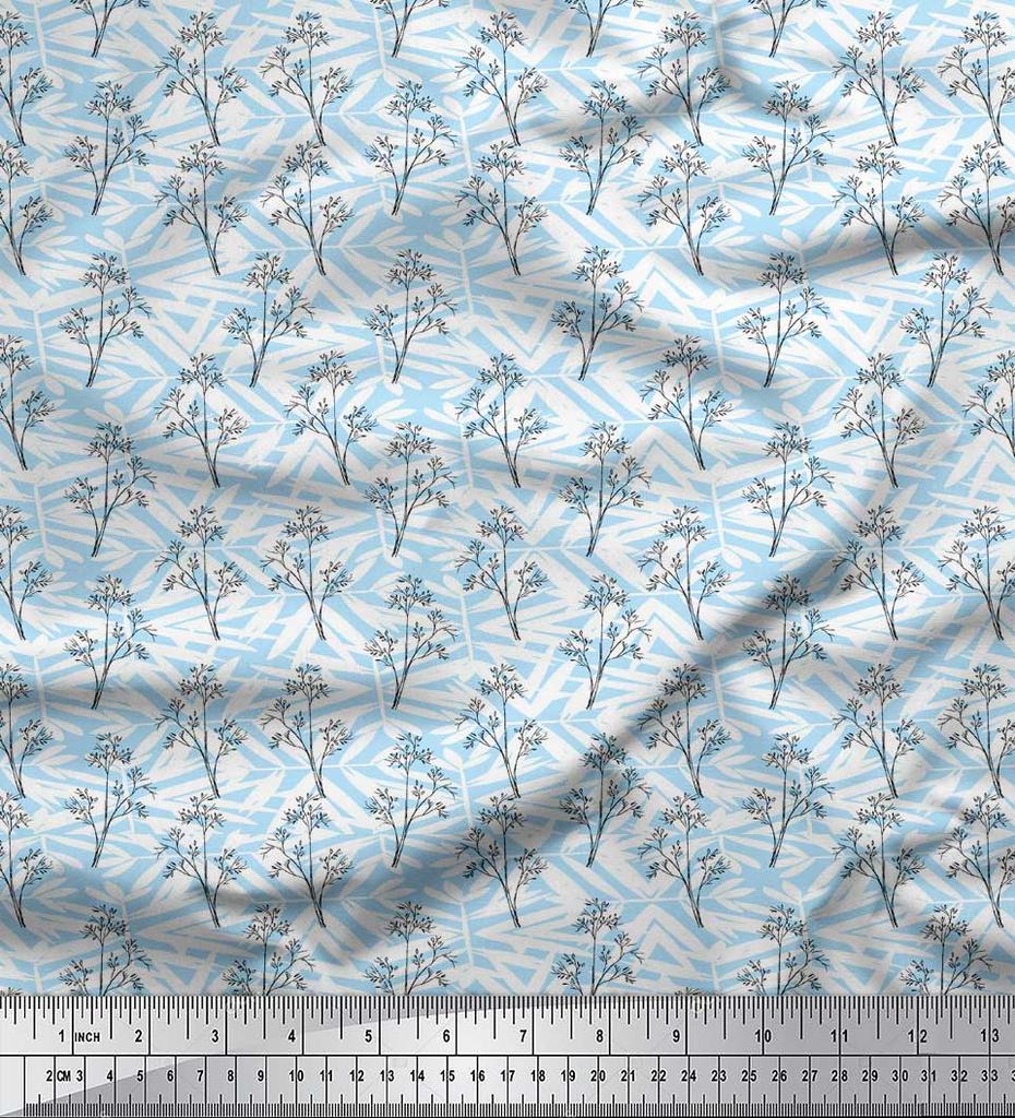 Soimoi Blue Poly Crepe Fabric Silhouette Branch Leaves Print Fabric by metre 42 Inch