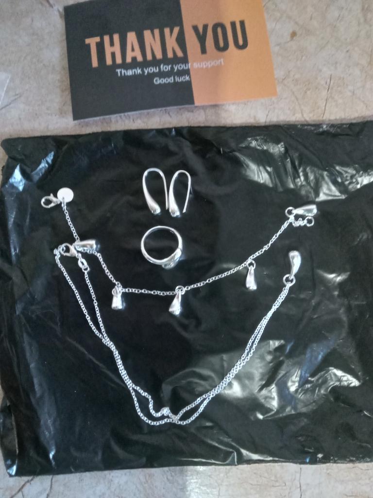 Набірчик (сережки, браслет та ланцюжок з кулоном у вигляді краплі) дуже мені сподобався. Ношу із задоволенням. Побачу як буде далі. Чи не буде стиратися срібне напилення. Бо у попереднього браслету (є проба 925) але в деяких місцях напилення стерлося і видно метал чи мідь чи то щось інше.