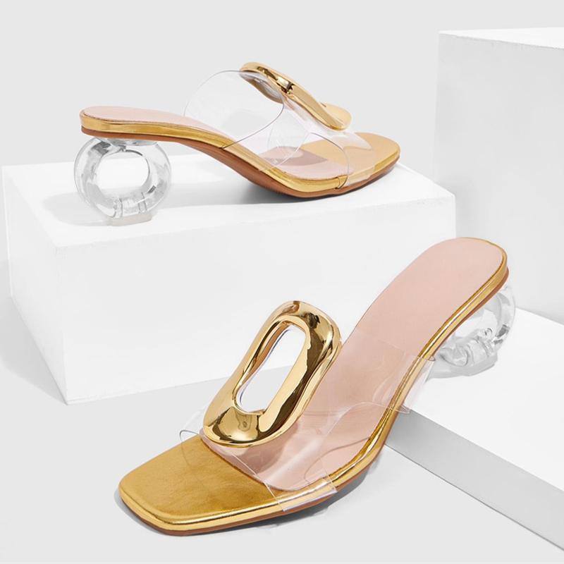 Fashion Liyke Fashion Hollow Out Metal Designer Slides Women Transparent Slippers Square Toe Strange Clear High Heels Mules Shoes Sandal
