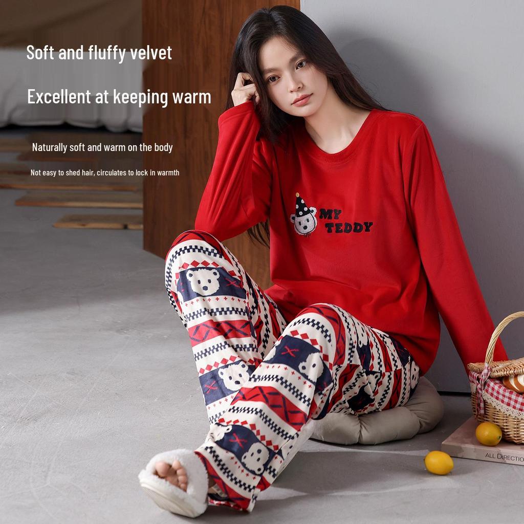 Women's Christmas Red Velvet Teddy Bear Pajamas - Warm, Breathable, Casual Coral Fleece Homewear for Autumn, Winter, Spring