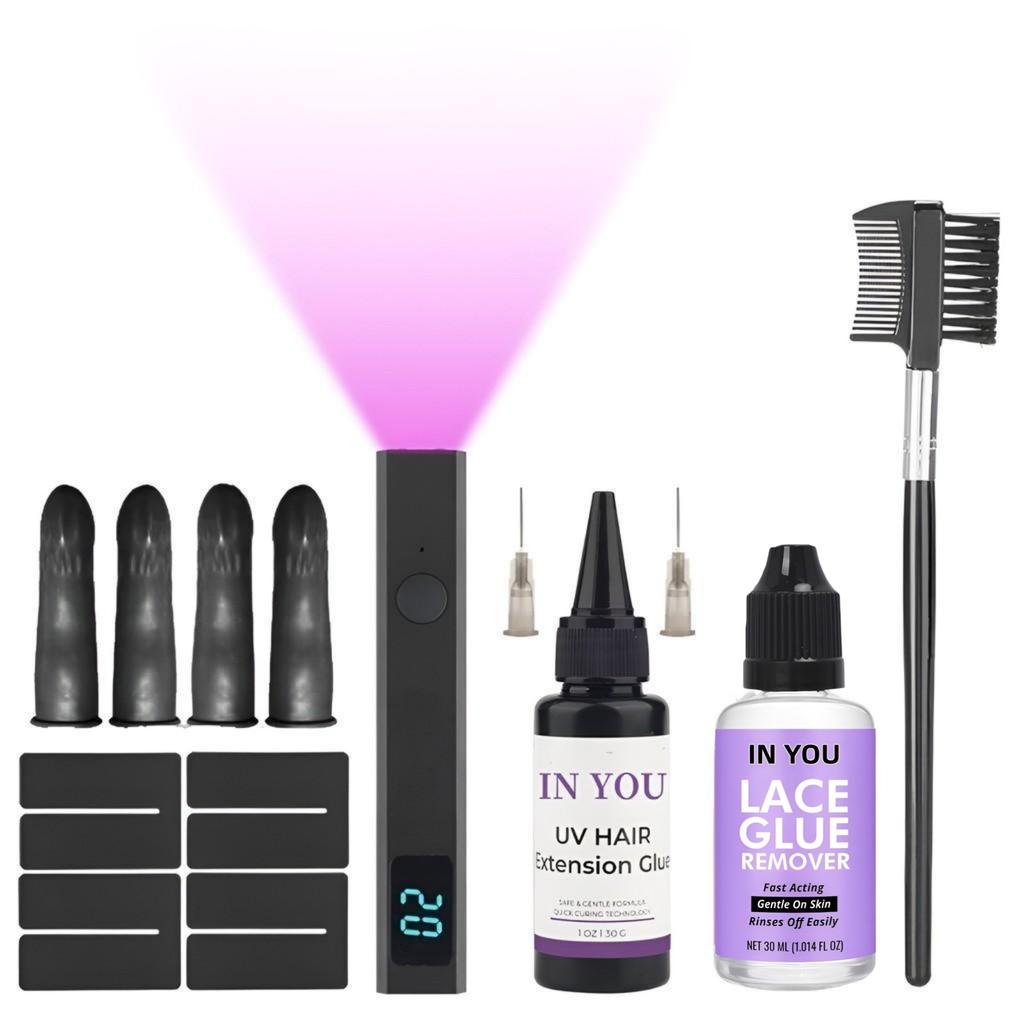 Complete UV Hair Extension Tool Kit with Fast-Curing Lamp, 30g Invisible Glue & Remover for Salon & DIY Hair & Lash Extensions