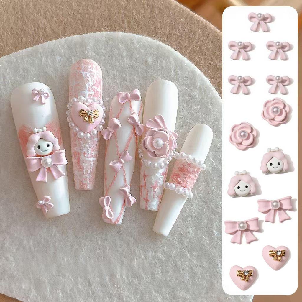 Cartoon Rose Pink Pearl Heart Bow Nail Accessories with Rhinestones