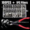 100-Piece Set: 304 Stainless Steel Single Ear Stepless Hose Clamps (5.3-15.3mm) with Pliers