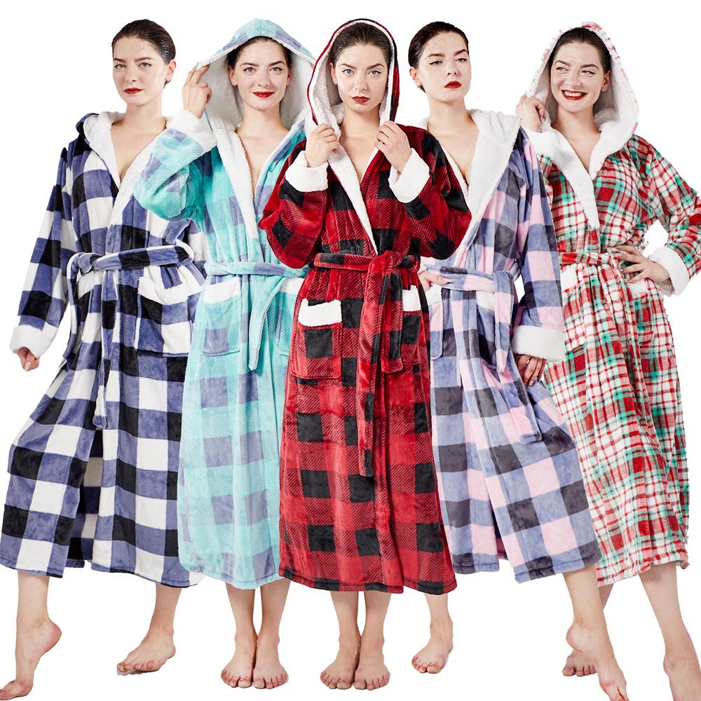 European & American Style Casual Warm Flannel Plaid Hooded Bathrobe Pajamas