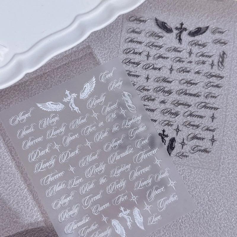 Чорно-білі літерні слова наклейки для нігтів Ангельські крила Змішані дизайни літер Голографічні Y2K Наклейки для декору нігтів своїми руками